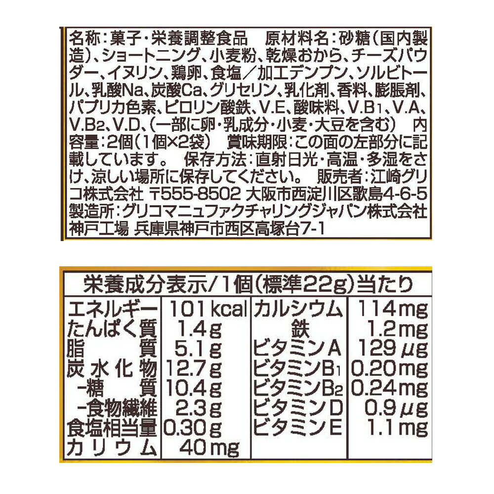 ●原材料砂糖、ショートニング、小麦粉、乾燥おから、チーズパウダー、イヌリン、鶏卵、食塩/加工デンプン、ソルビトール、乳酸Na、炭酸Ca、グリセリン、乳化剤、香料、膨脹剤、パプリカ色素、ピロリン酸鉄、V.E、酸味料、V.B1、V.A、V.B2、V.D、(一部に卵・乳成分・小麦・大豆を含む)●保存方法直射日光・高温・多湿をさけ、涼しい場所に保存してください。