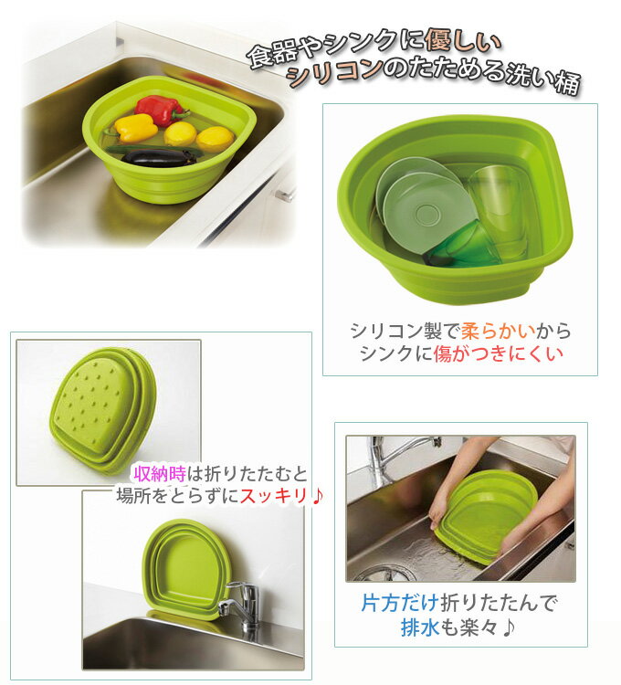 商 品 詳 細 食器やシンクに優しい、たためる蛇腹式のシリコン製洗い桶です。
