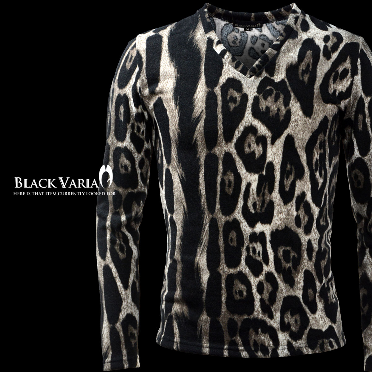 Tシャツ Vネック ヒョウ柄 豹柄 メンズ 日本製 細身 ニット 長袖Tシャツ mens(グレー灰ブラック黒) 163913