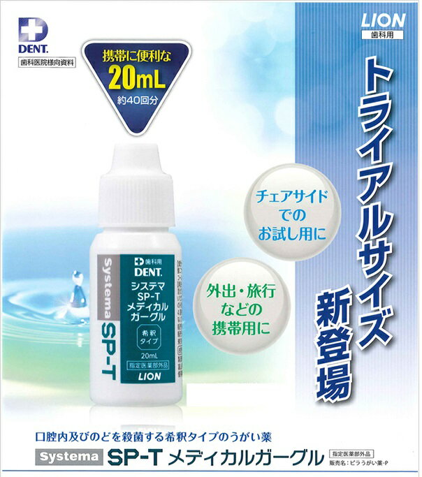 【仕様】 ●200倍希釈 ●医薬部外品 ●内容量: 20ml 【関連商品】 ◆ライオン システマSP-T 【メディカルガーグル100ml】1本 ◆送料無料◆ライオン システマSP-T 【メディカルガーグル100ml】×6本 ◆ライオン システマSP-T 【メディカルガーグル20ml】1本 ◆ライオン システマ【SP-Tジェル85g】1本 ◆ライオン システマ【SP-T歯ブラシ】1本 ◆ライオンシステマSP-T【ガーグル100ml+ジェル85g+ハブラシ1本】1セットと言った歯科専売品を今回発売!!